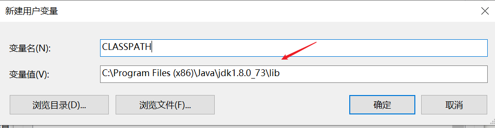 6.新建第二个变量,变量名为“CLASSPATH”,变量值为JDK根目录的lib目录