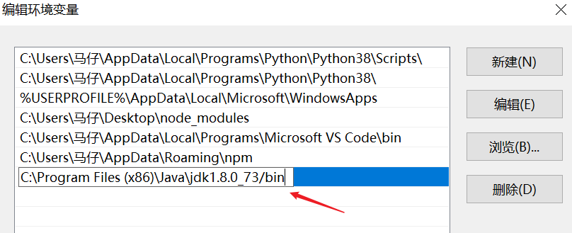 8.然后进入“PATH”变量中我们点击“新建”,变量值为JDK根目录的bin