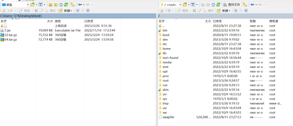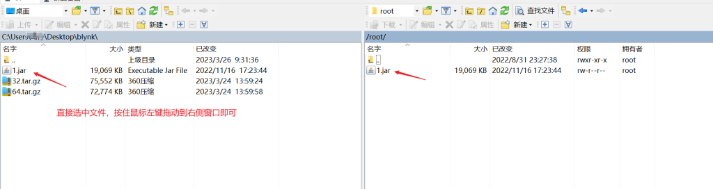 2.把blynk文件夹中的1.jar上传到/root/文件夹里(资料链接放文末了)